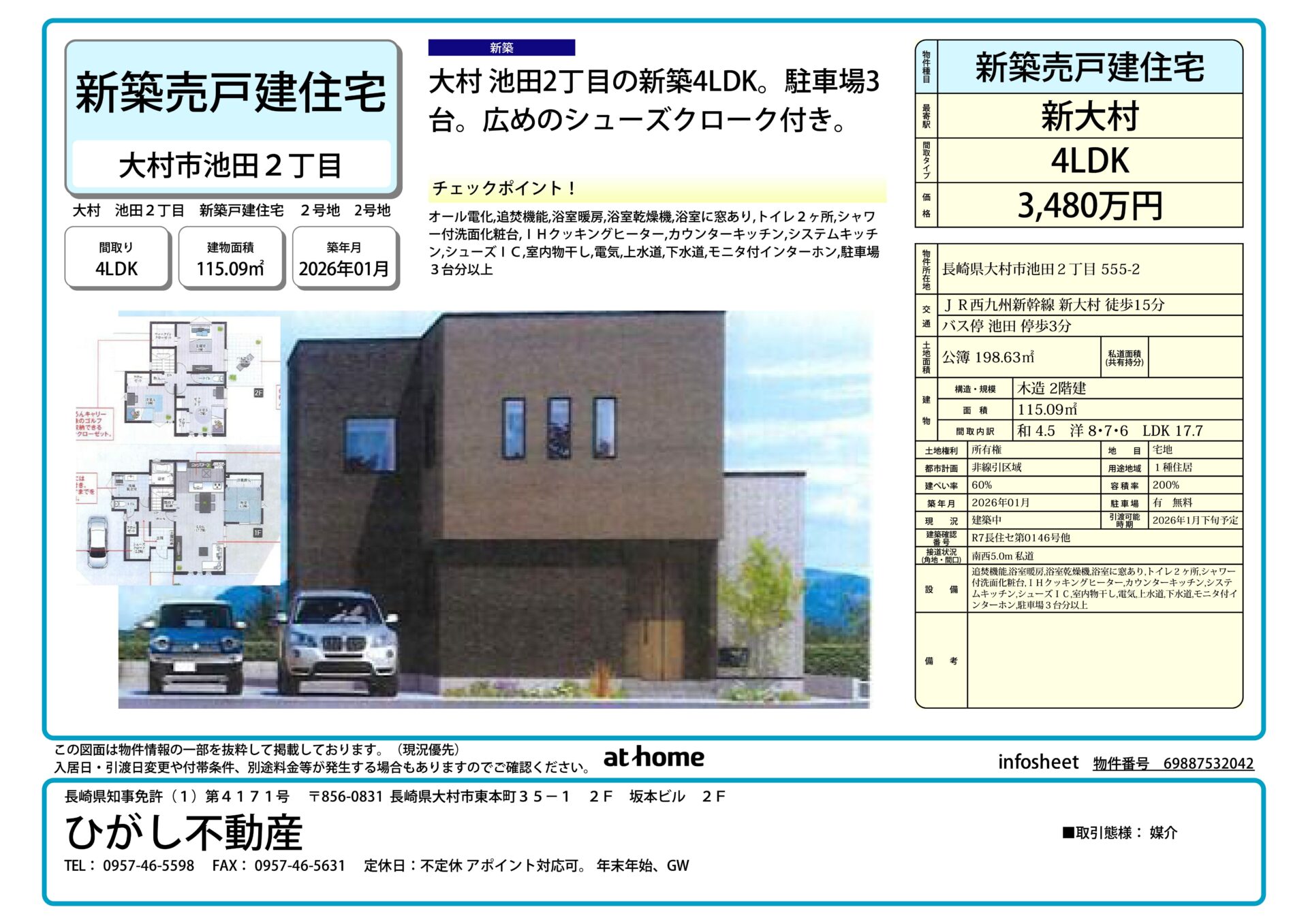| エンド向けアピール | スーパーまで徒歩3分。高速バス停も大村ICまで徒歩9分の立地の物件、更に車中心生活を支える駐車場3台分だから、身内や友人グループを気軽に呼ぶことができます。また真っさら新築の物件で、その上エコ意識が自然と高まるオール電化仕様なので、光熱費が一本化され家計の見直しにも重宝します。ちなみに配膳がラクなカウンターキッチン付です。家族の物語が生まれる4LDK。ご案内いたしますのでお気軽にご連絡ください。2026年1月末には完成している予定です。同じ建築会社の完成物件を見ておきましょう。お供します。 |
