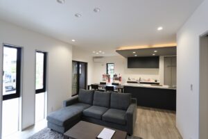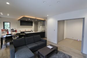リビングです。ダウンライトが素敵ですね。19.7帖です。ソファー・テーブルは付いてません。(交渉の余地はあるかな?)