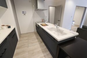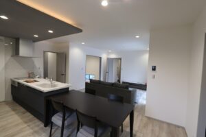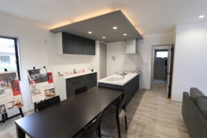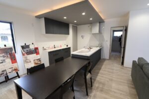 キッチンですね。テーブルは付いてませんよ。カップボード・パントリー・床下収納・食洗器・IHコンロついてます。これついてこの価格はうれしいですよ。