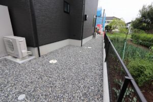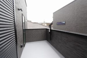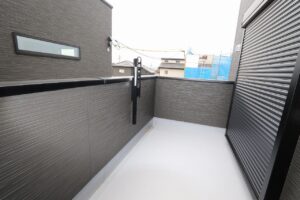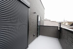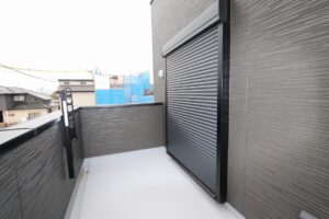 これがベランダです。シャッターもついてますよ。選択干し場になるかな?1階の敷地にも洗濯物干せますよ。(裏側以外に広めにスペースとってあります)